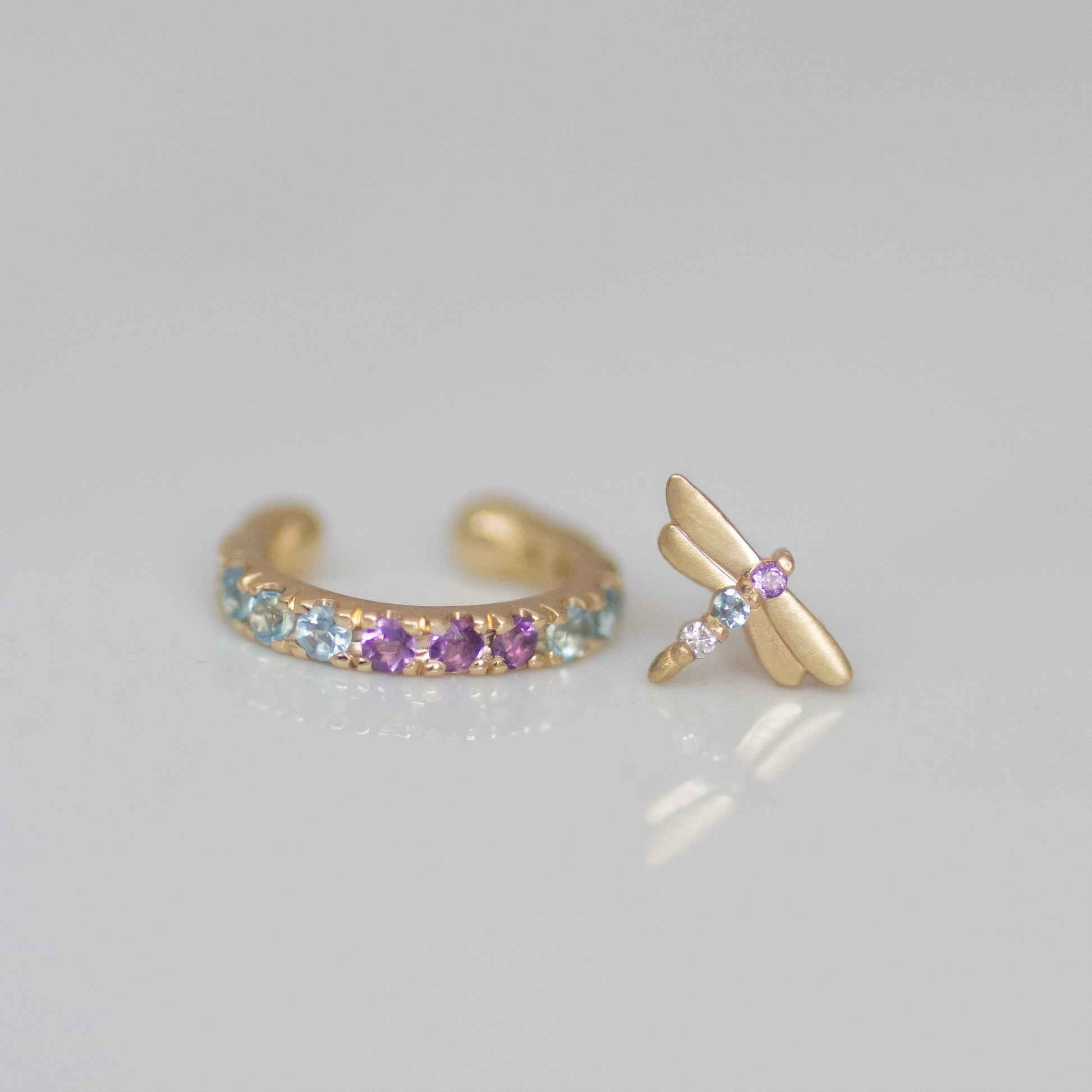 Set with an amethyst, aquamarine, and a diamond, the dragonfly shines as a symbol of lightness, change, and delicate beauty.