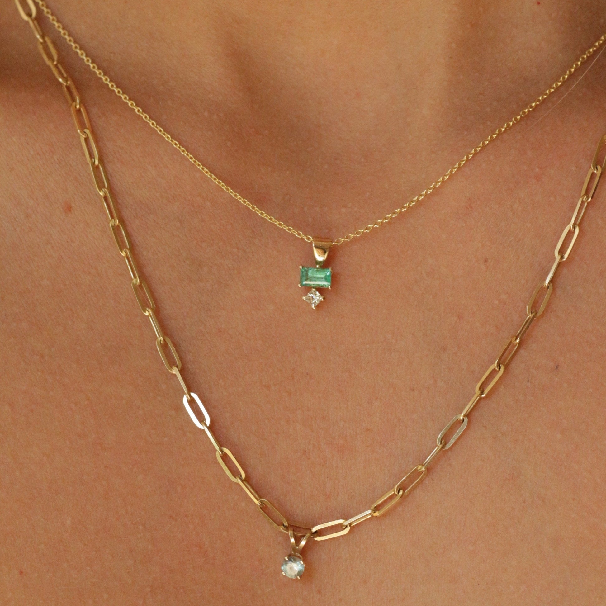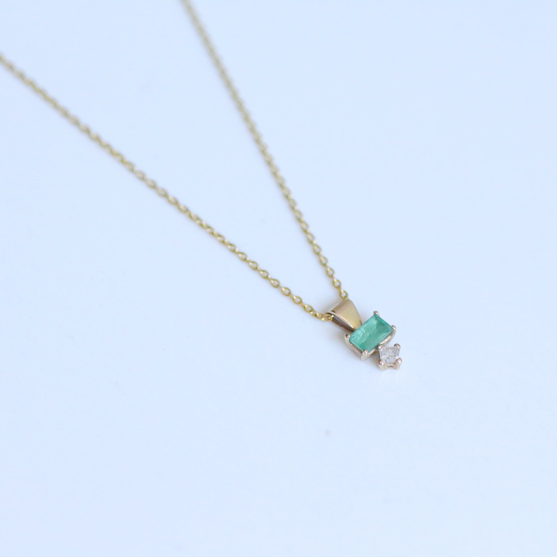 This necklace features a 0.5ct emerald and a 0.10ct princess cut lab diamond set in 14k Gold.