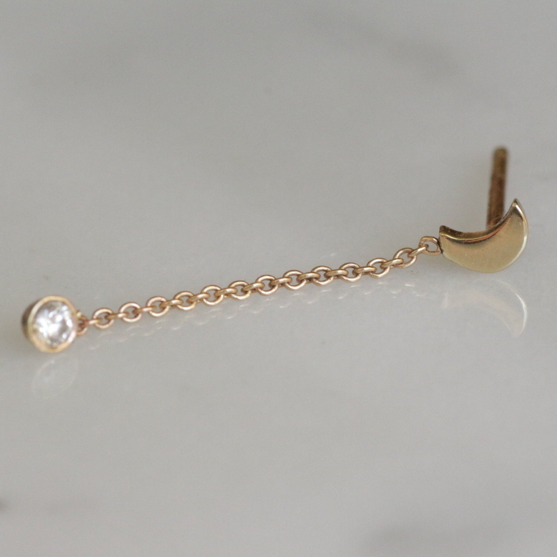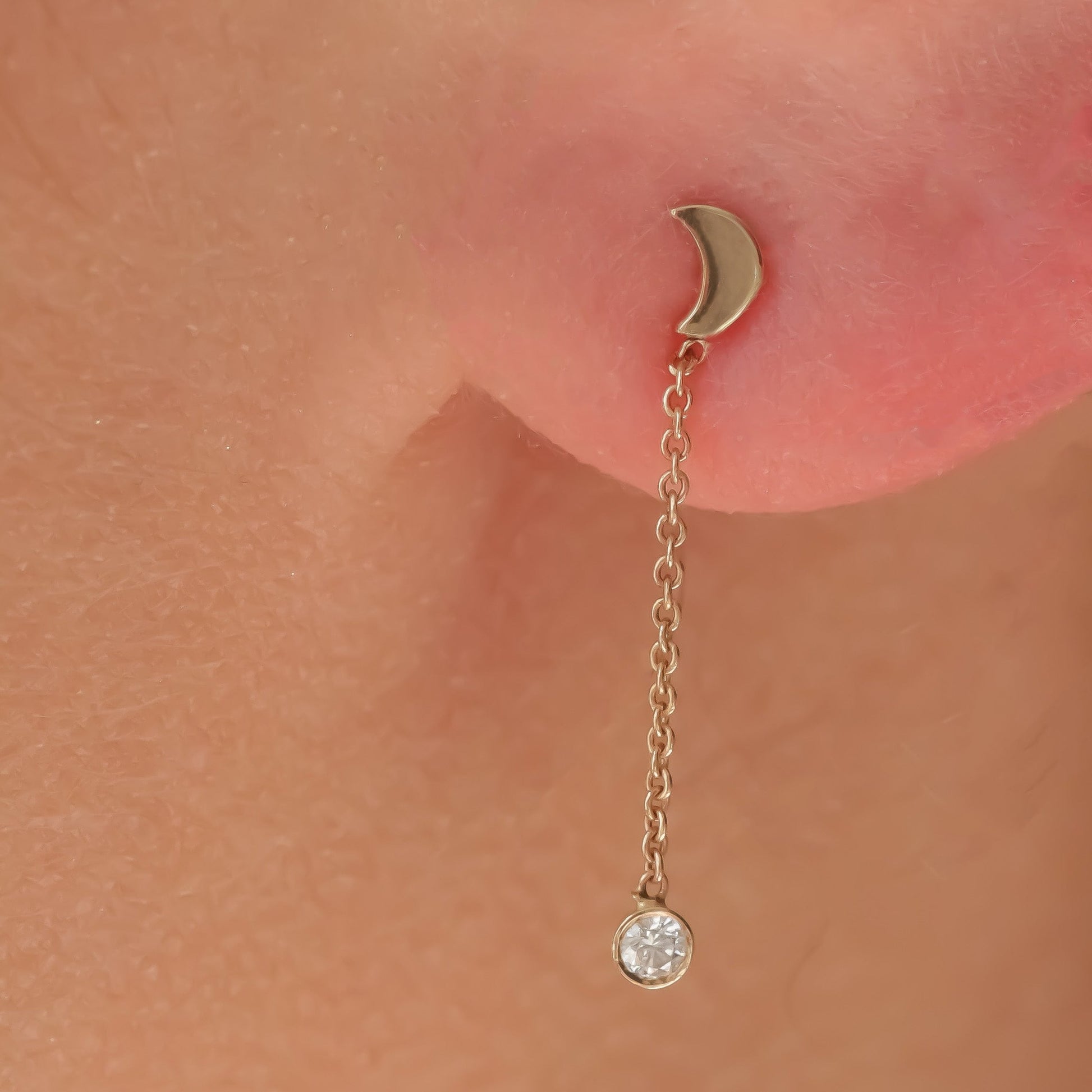 This single earring features a tiny golden moon with a diamond hanging from its end.