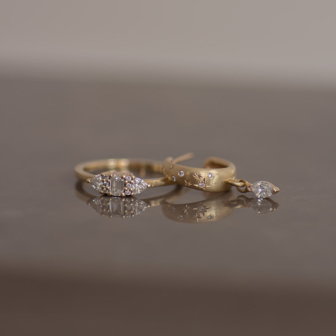 This gorgeous statement hoop was inspired by the structured disorder of the universe. Hand engraved with stars and set with diamonds, this earring is truly one of a kind.