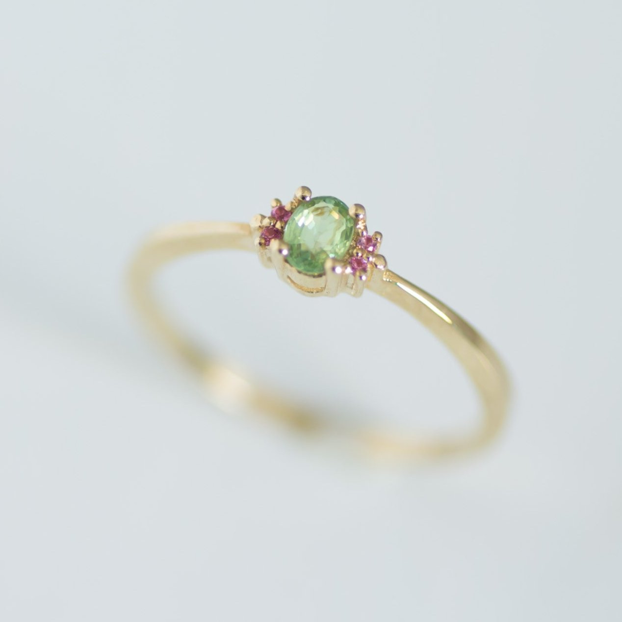 Set with a green Sapphire center gemstone and pink Sapphire.