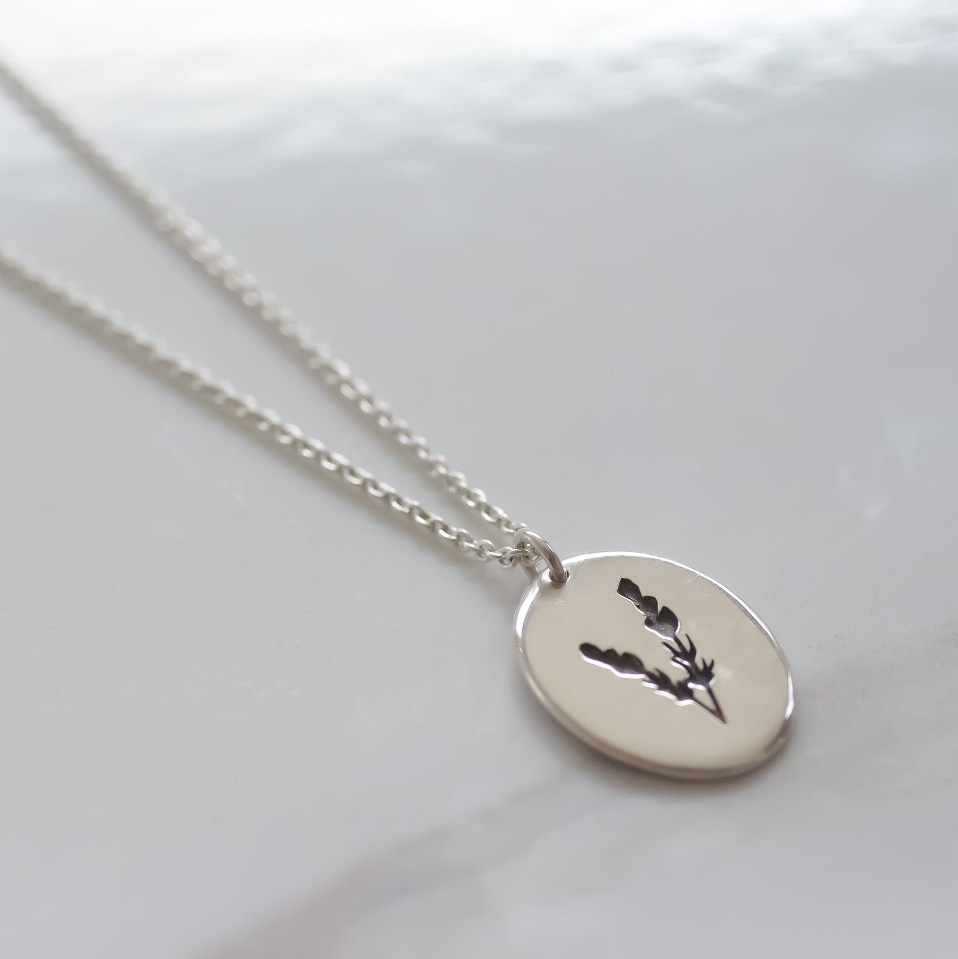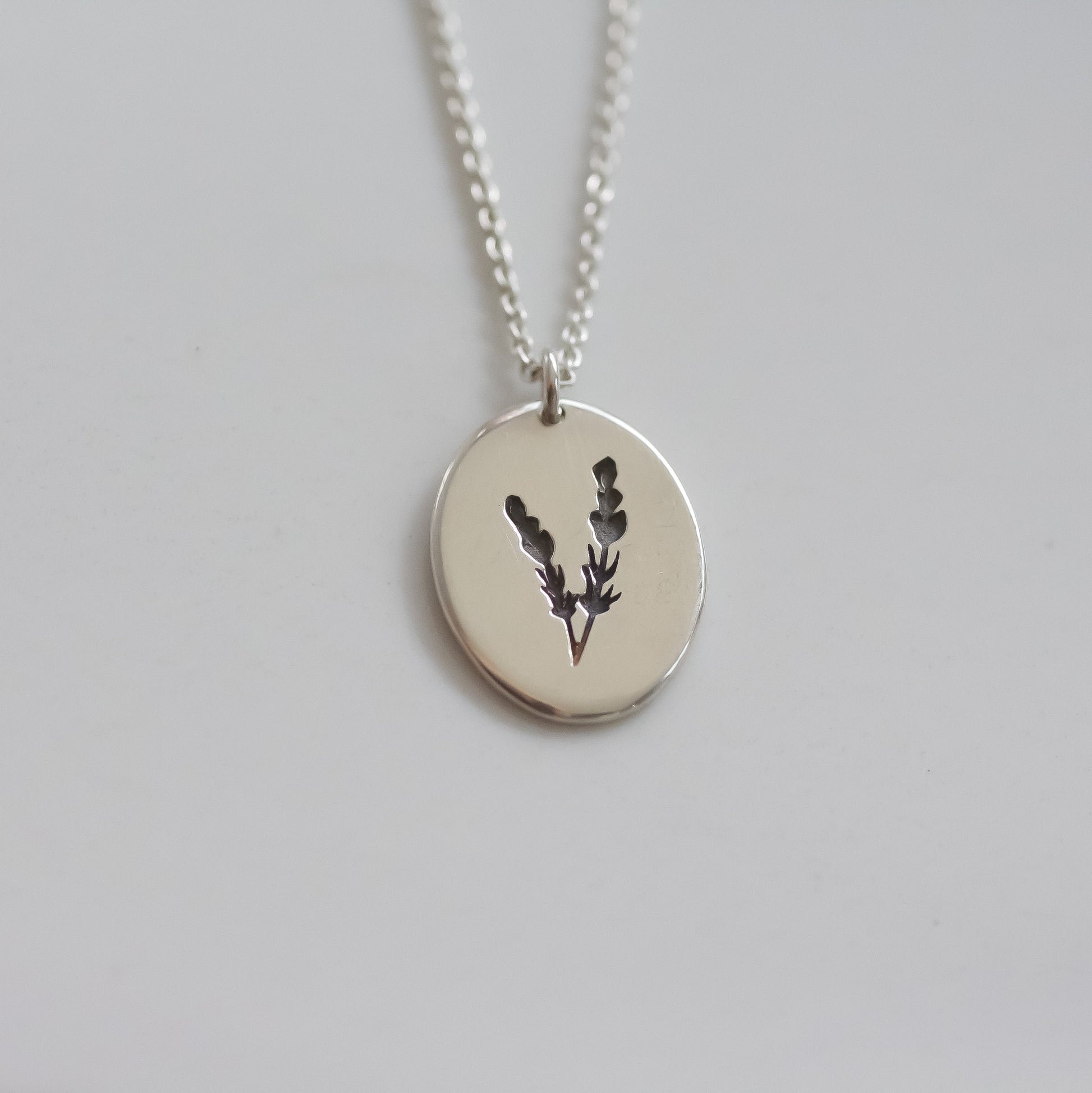 This sterling silver Lavender necklace is a timeless accessory, featuring a stylish lavender engraving.
