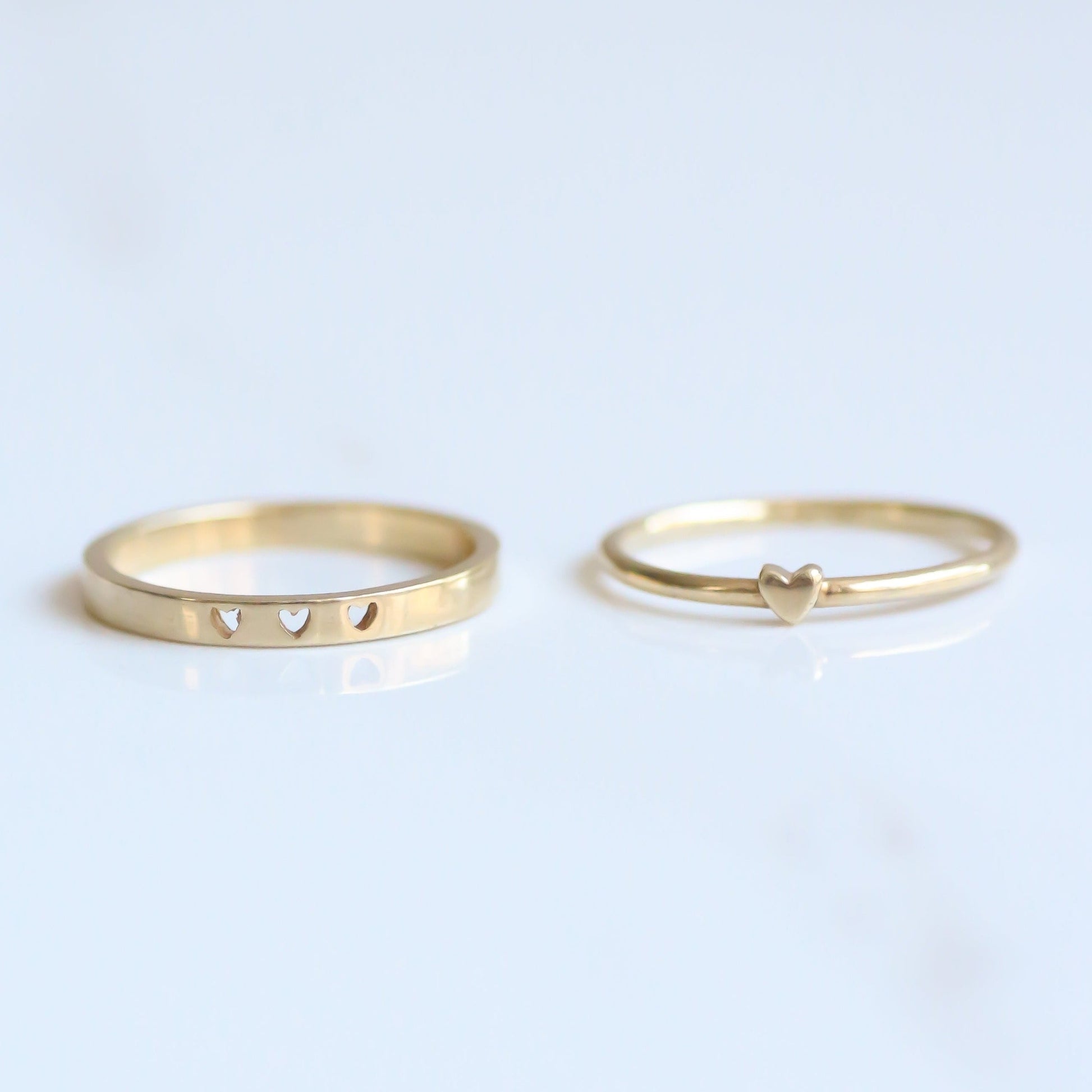 This romantic 14k gold Lover's Ring Set includes two stunning heart rings - one dainty and one with three holed hearts - for an ideal match.