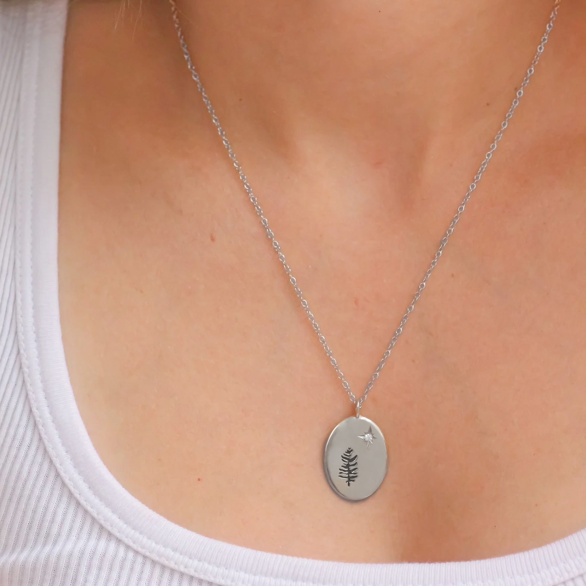 Our classic and Moonlight necklace featuring a pine tree and a star set zircon.