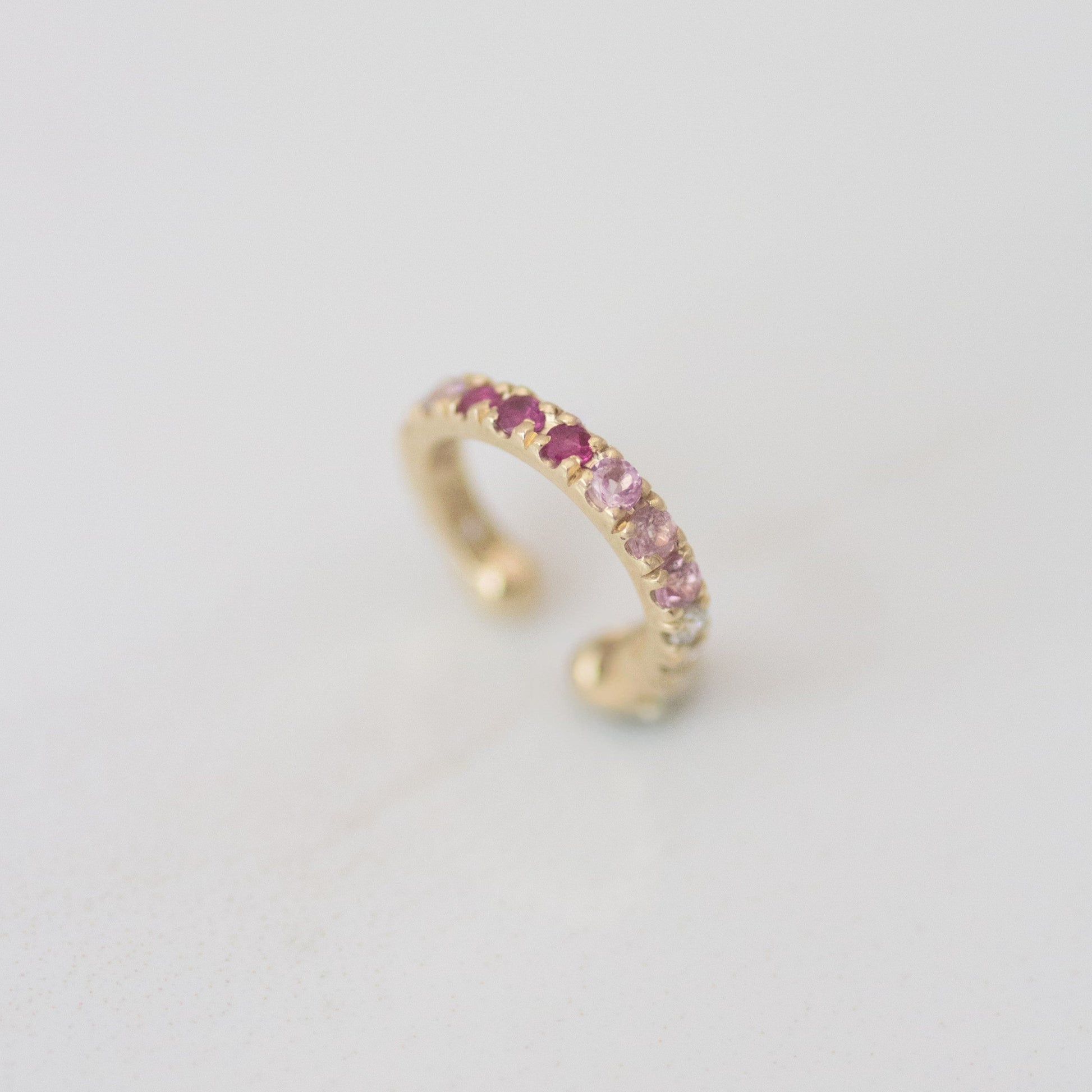 No piercing required — the Rose Cuff curves gracefully around the ear, sparkling with rubies, pink sapphires, and diamonds. A versatile piece, perfect for layering or wearing alone.