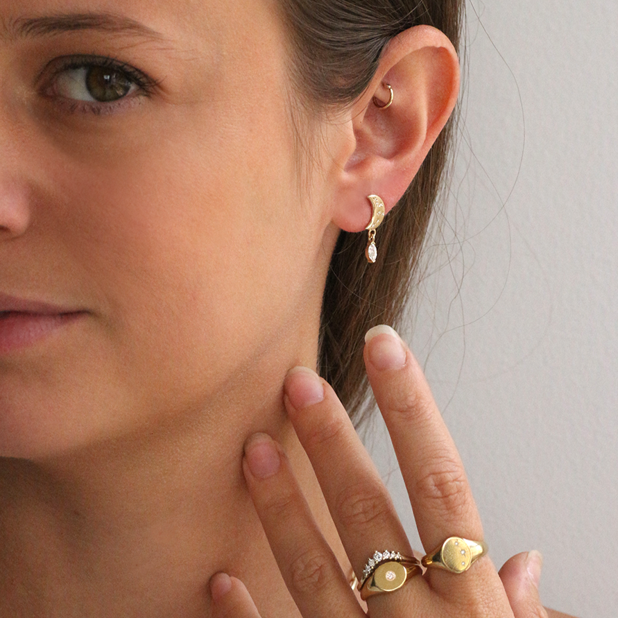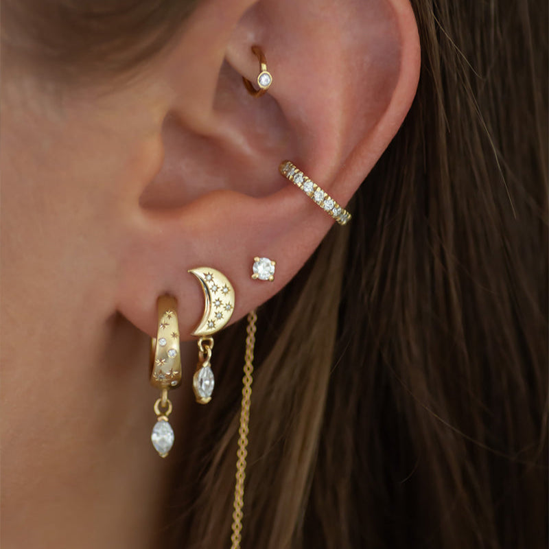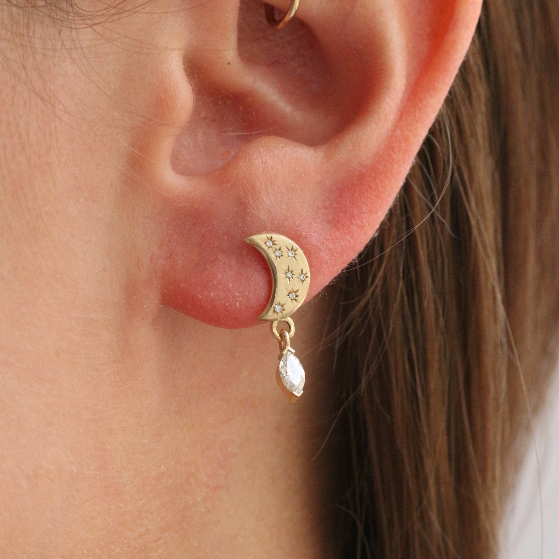 This divine earring features 7 sparkly star set diamonds on a chunky golden moon with a beautiful marquise falling diamond.