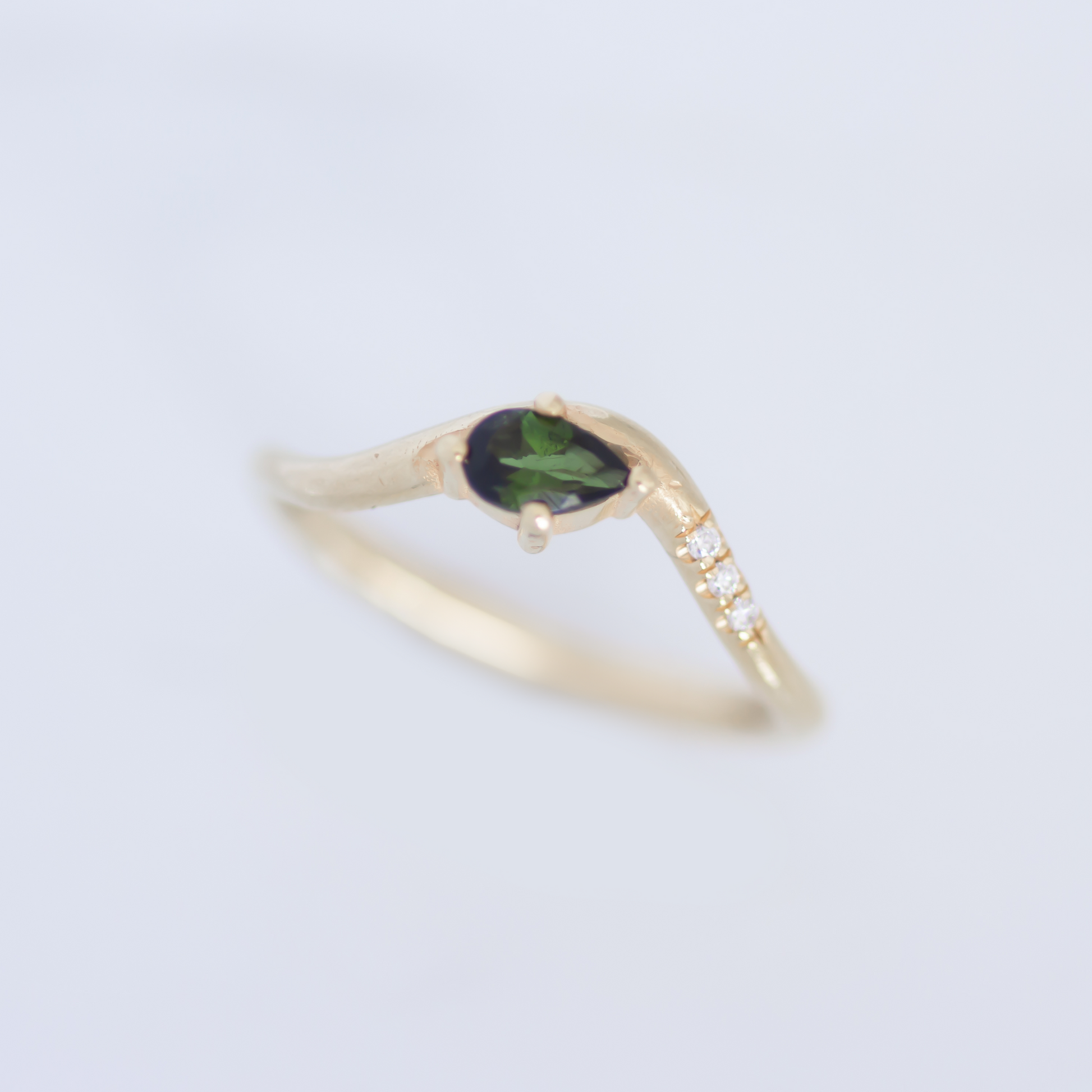 This symbolic piece reminds us to persevere through any obstacles. Its unique design truly captures the strength and resilience of the willow tree. Set with a mesmerizing dark green pear shaped tourmaline and accented with 3 diamonds, this is a ring you'll definitely want to show off.